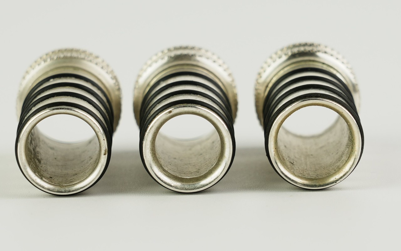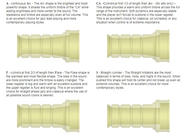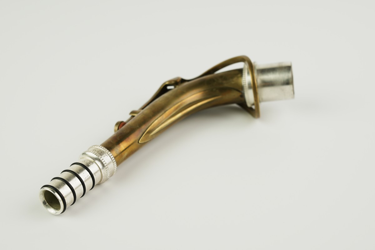 このアルトサックス用ネックの先端部分は、トランペットのマウスピースの内部のように、3種類の内部形状が異なるモジュールになっており、それをねじ込み式で交換できます。