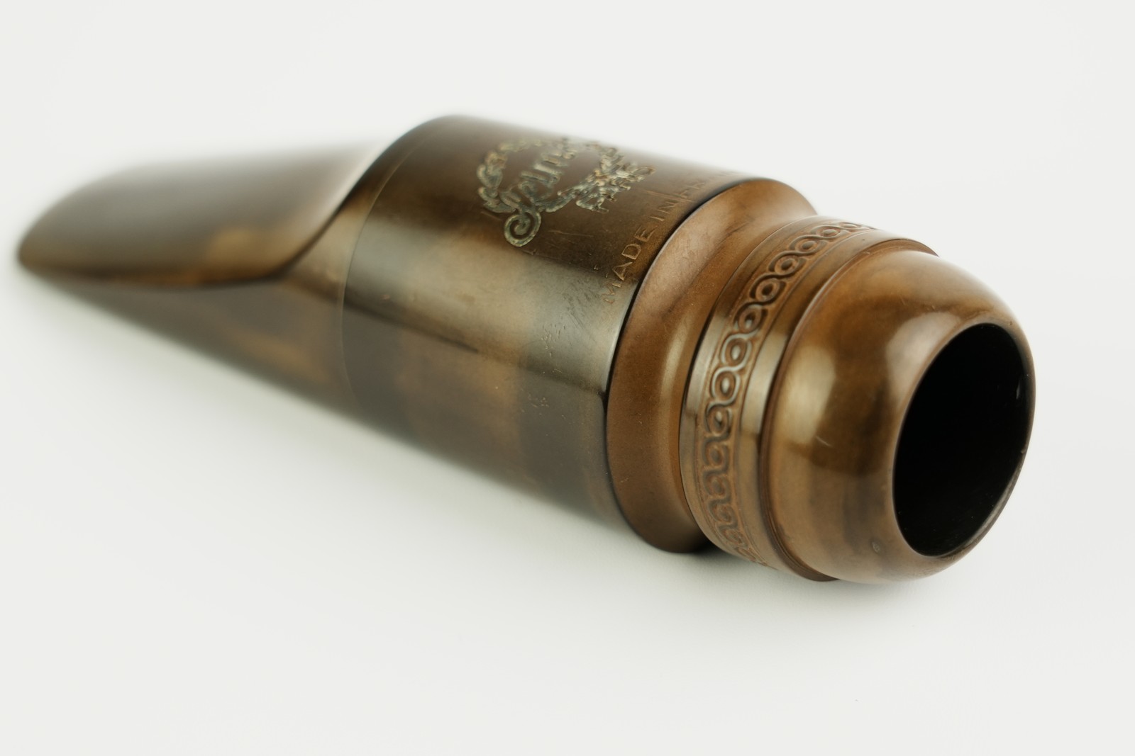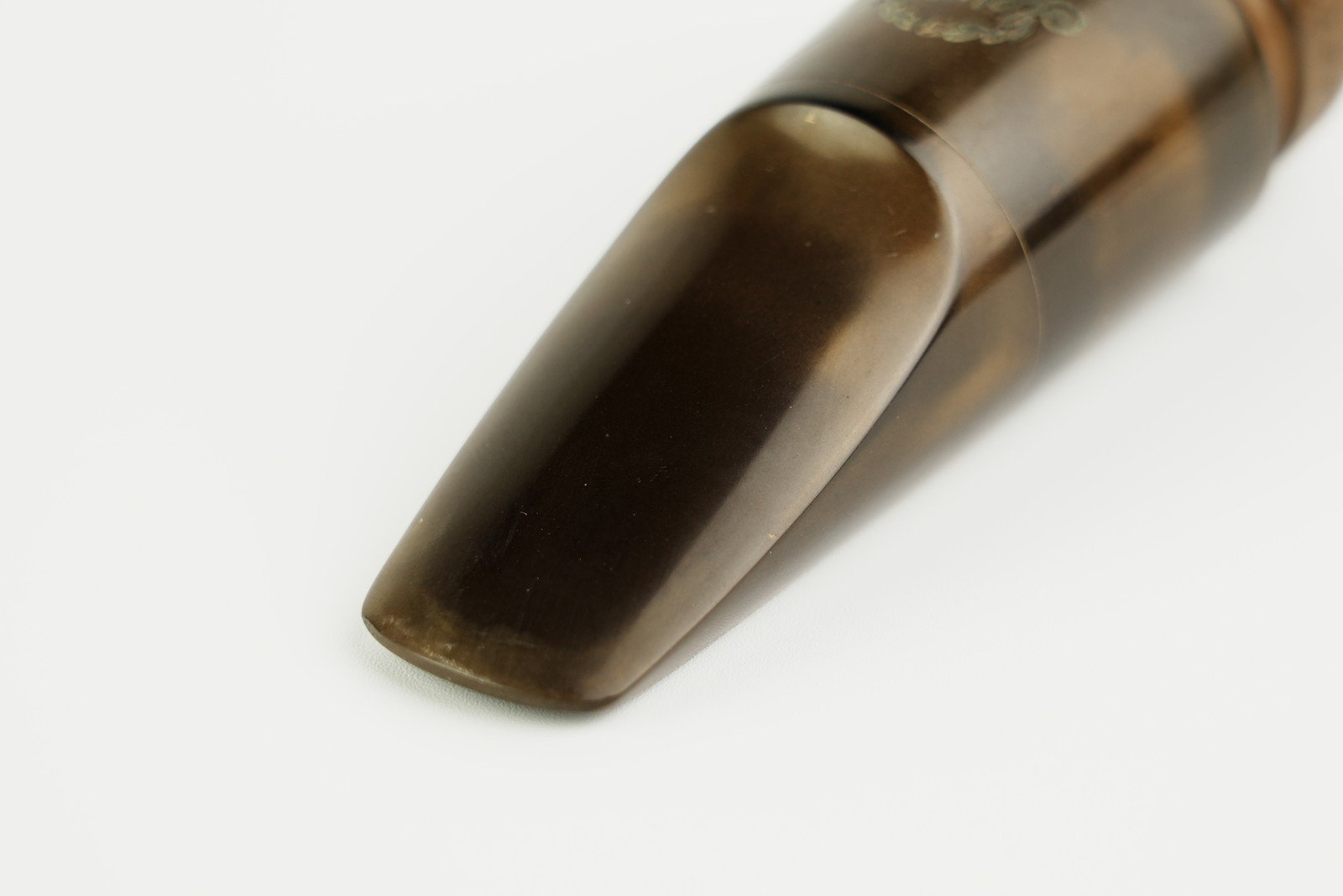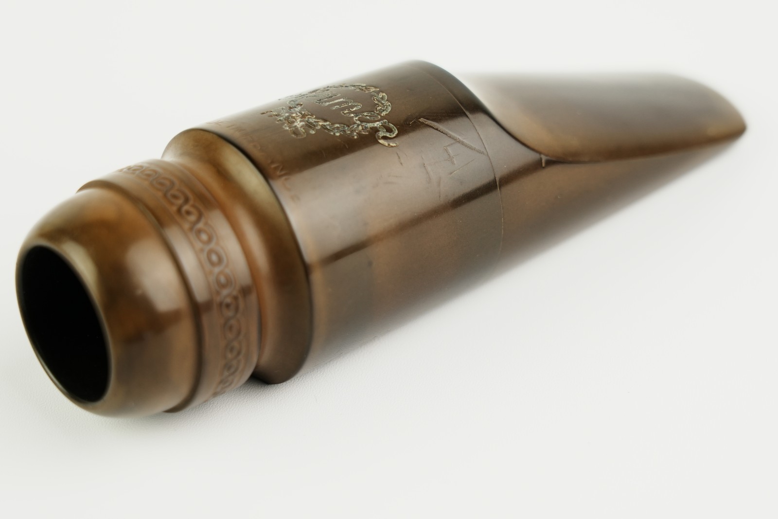 開きは1.85mmでメイヤーでは5Mと6Mの中間の開きです。彼は自分のマウスピース造りに専念しており、もうリフェースをやっていませんので、彼のリフェース品は大変希少です。 チェンバーはソロイスト独特の馬蹄形です。